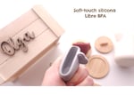 La mezcla de materiales ofrece una rica experiencia sensorial: el niño experimenta el contraste entre la silicona suave y flexible de las tazas y la firmeza natural de la madera.