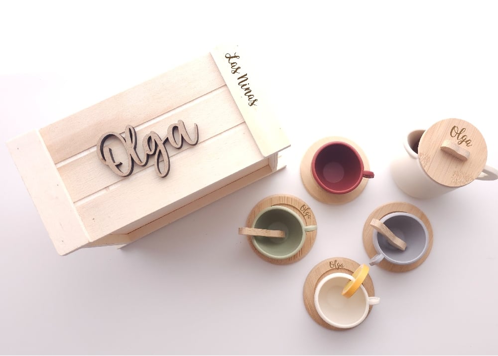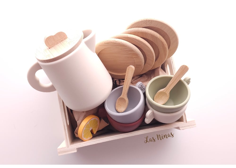 Tetera de silicona con tapa, 4 tazas de tacto suave, 4 platos de bambú con nombre grabado, cucharas de madera, rodaja de limón y caja personalizada con su nombre.