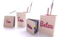 - Bote lapicero de madera personalizado en la delantera con nombre superpuesto pintado a mano .