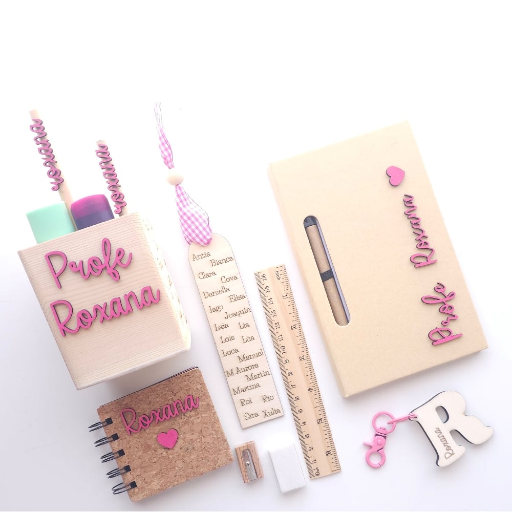 Este conjunto es un regalo genial porque incluye absolutamente todo lo que un profesor necesita para su mesa, con la magia de que todas las piezas van grabadas y personalizadas a juego. Es el regalo de grupo perfecto por su gran variedad de detalles.