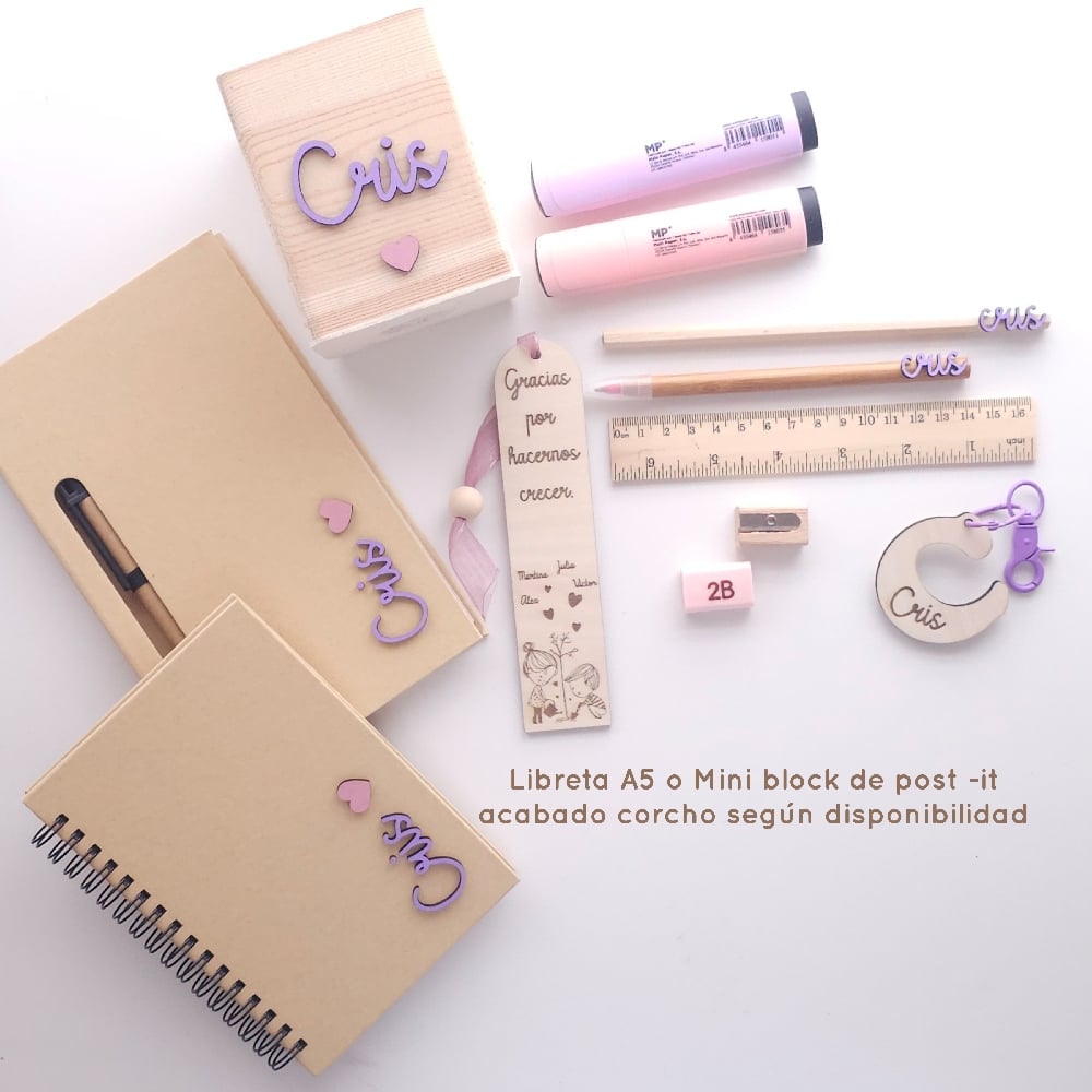- Libreta A5 o Mini Libreta de Corcho: (según disponibilidad añadimos uno u otro).Dos tamaños diferentes para notas importantes y apuntes rápidos, ambas personalizadas.