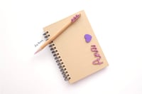 Libreta A5 de anillas con tapa de cartón reciclado rígido con 80 hojas rayadas de pauta ancha personalizada combinado con bolígrafo de bambú a juego o con lápiz en madera natural sin punta tambien a juego.