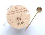 Capacidad de 450ml , cuchara metálica dorada y tapa en bambú que además hace de posavasos.