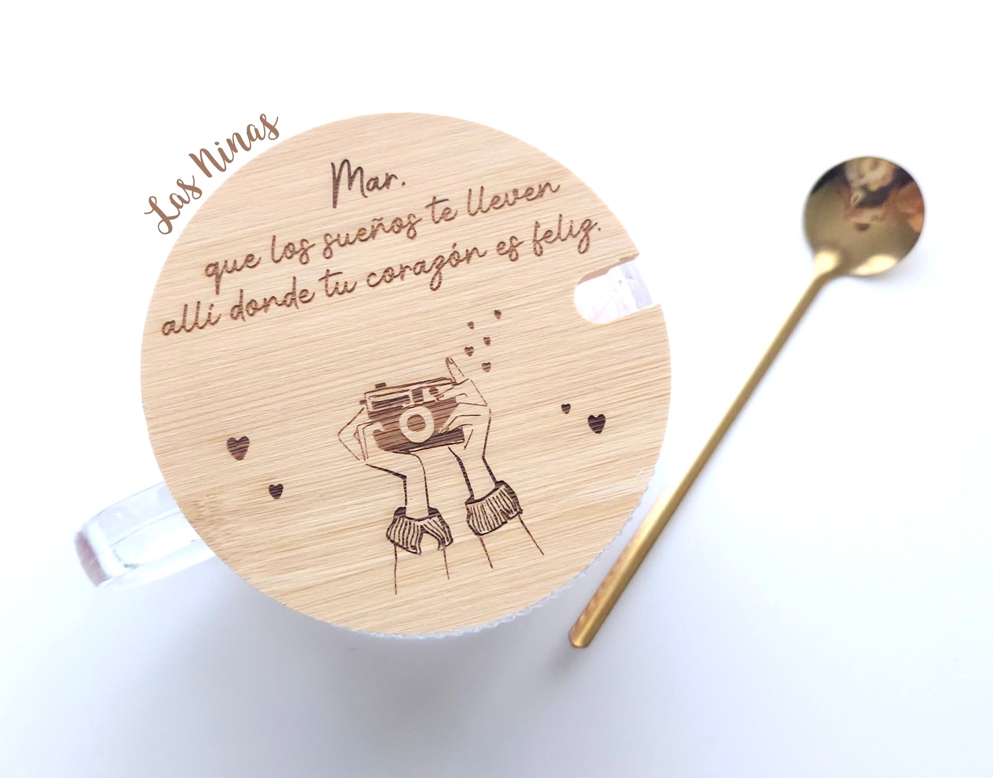 Su diseño delicado y atemporal se complementa a la perfección con su tapa de bambú natural , lista para personalizar con la frase o dedicatoria especial que más gustes.