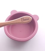 Este divertido conjunto de vajilla en silicona flexible, de cuenco osito y cuchara grabada con su nombre , es un regalazo ideal y muy práctico.